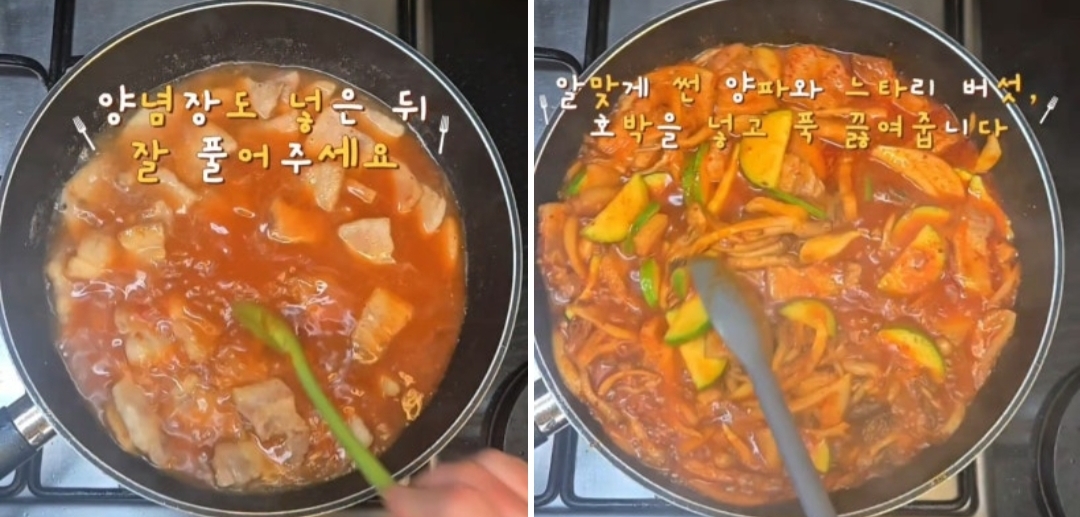 3. 양념장을 풀어주고 양파와 버섯, 애호박을 넣고 중불에 15분 이상 푹 끓여주세요.