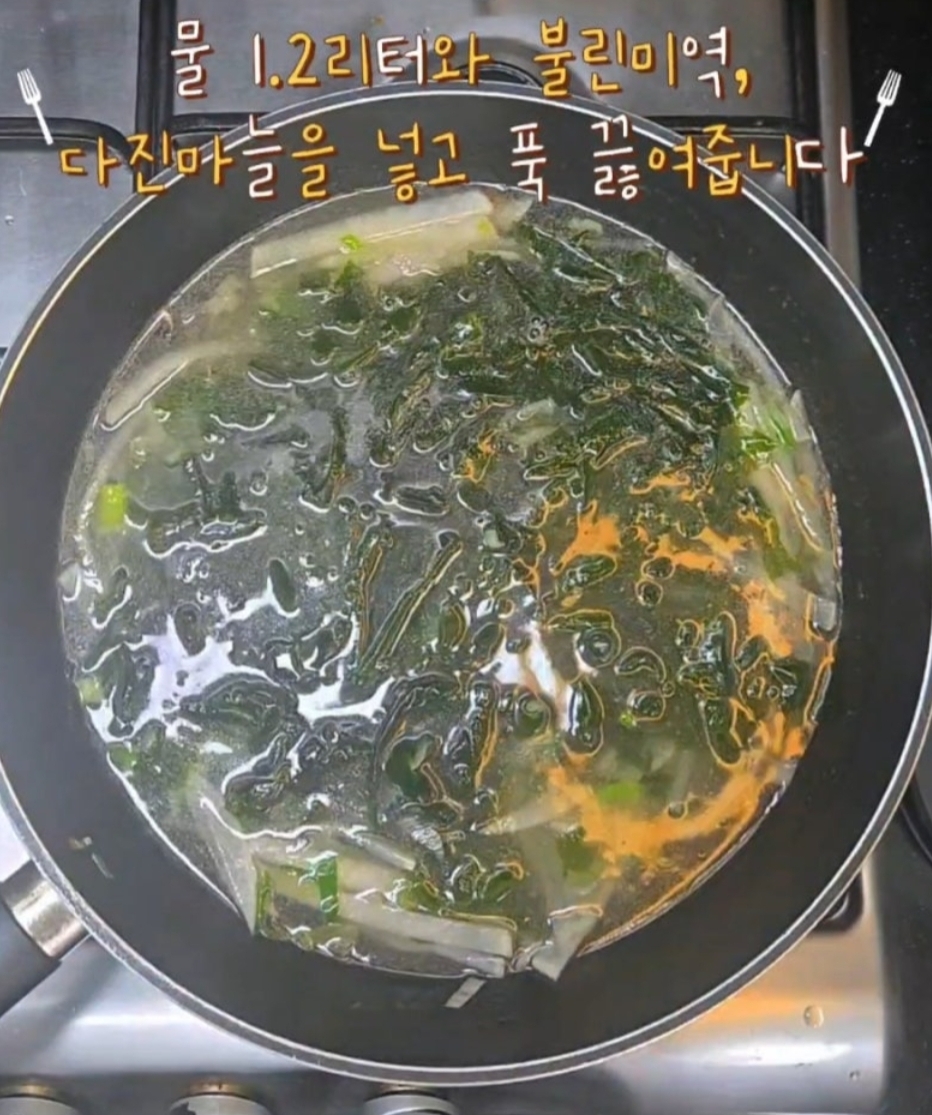 5. 야채에 간이 잘 배어들었으면 물 1.2L와 불린 미역, 다진 마늘을 넣고 푹 끓여줍니다.