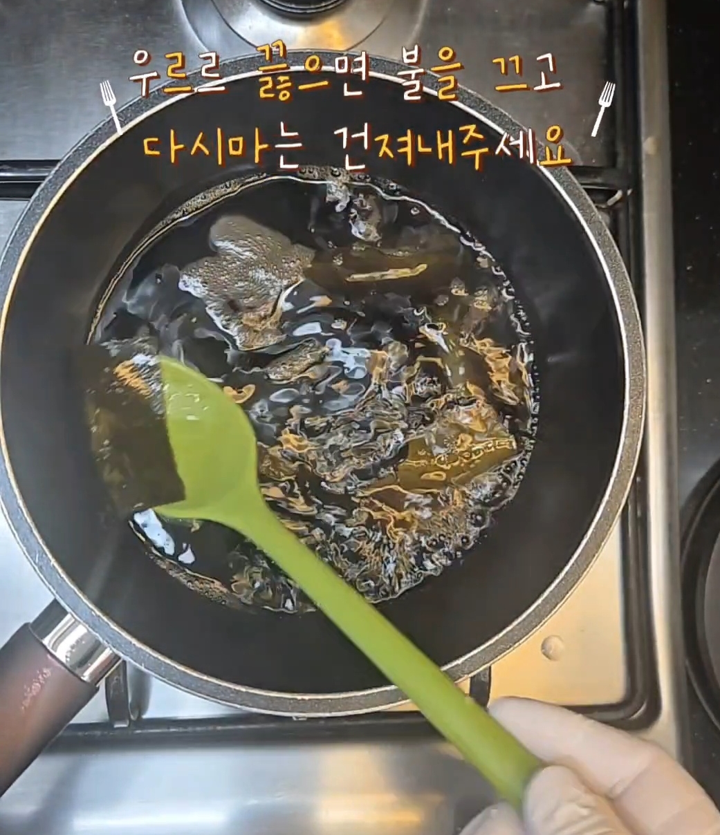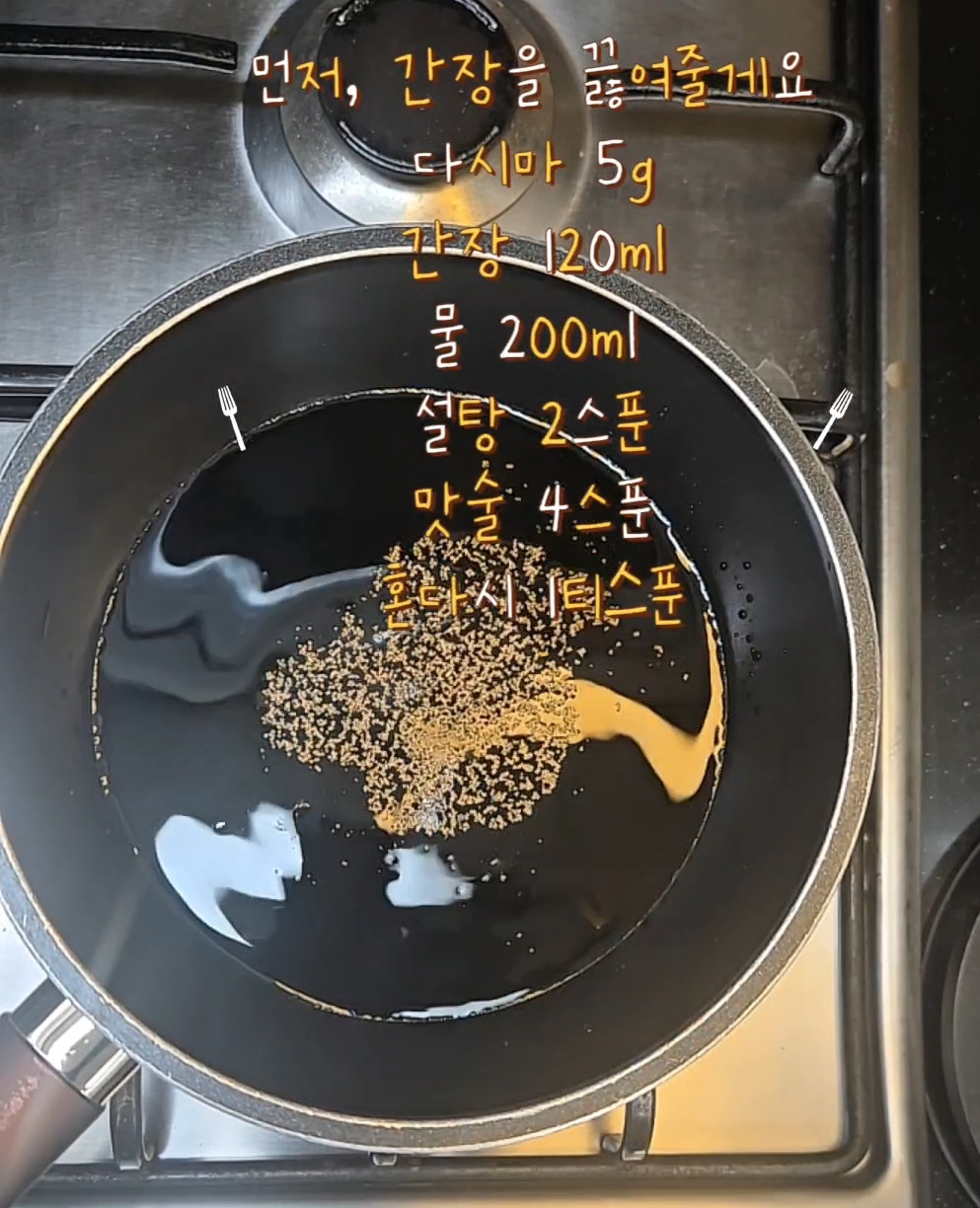 1. 다시마 5g, 간장 120ml, 물 200ml, 맛술 4스푼, 설탕 2스푼, 혼다시 1 티스푼을 넣고 끓여줍니다.