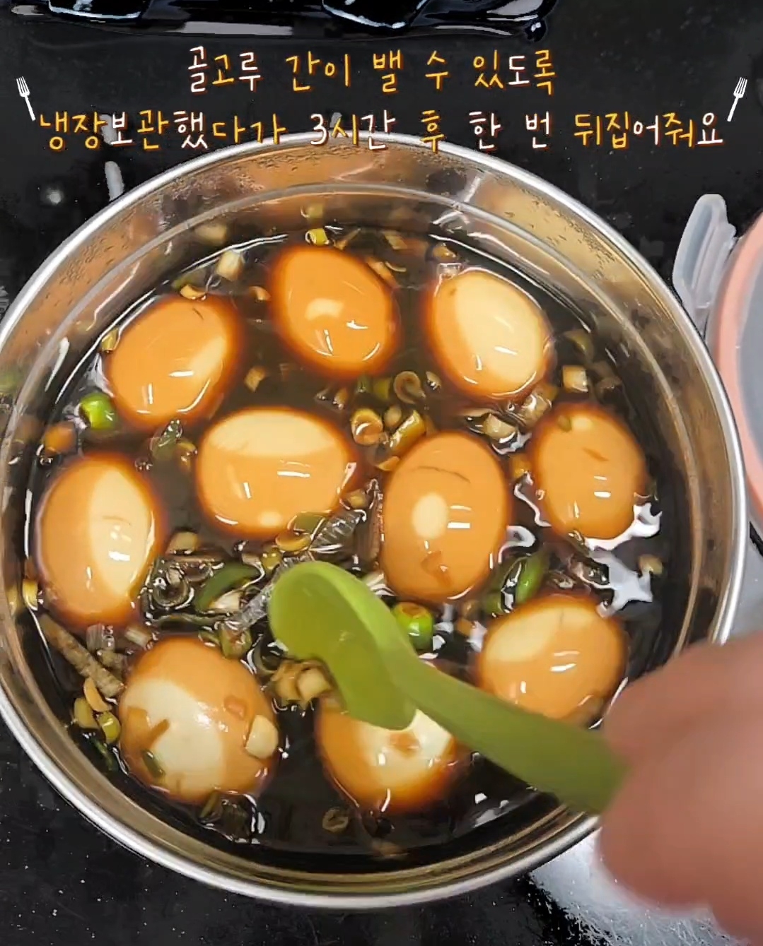 7. 골고루 간이 배도록 냉장보관했다가 3시간 후 꺼내 계란을 한 번 뒤집어줍니다.
