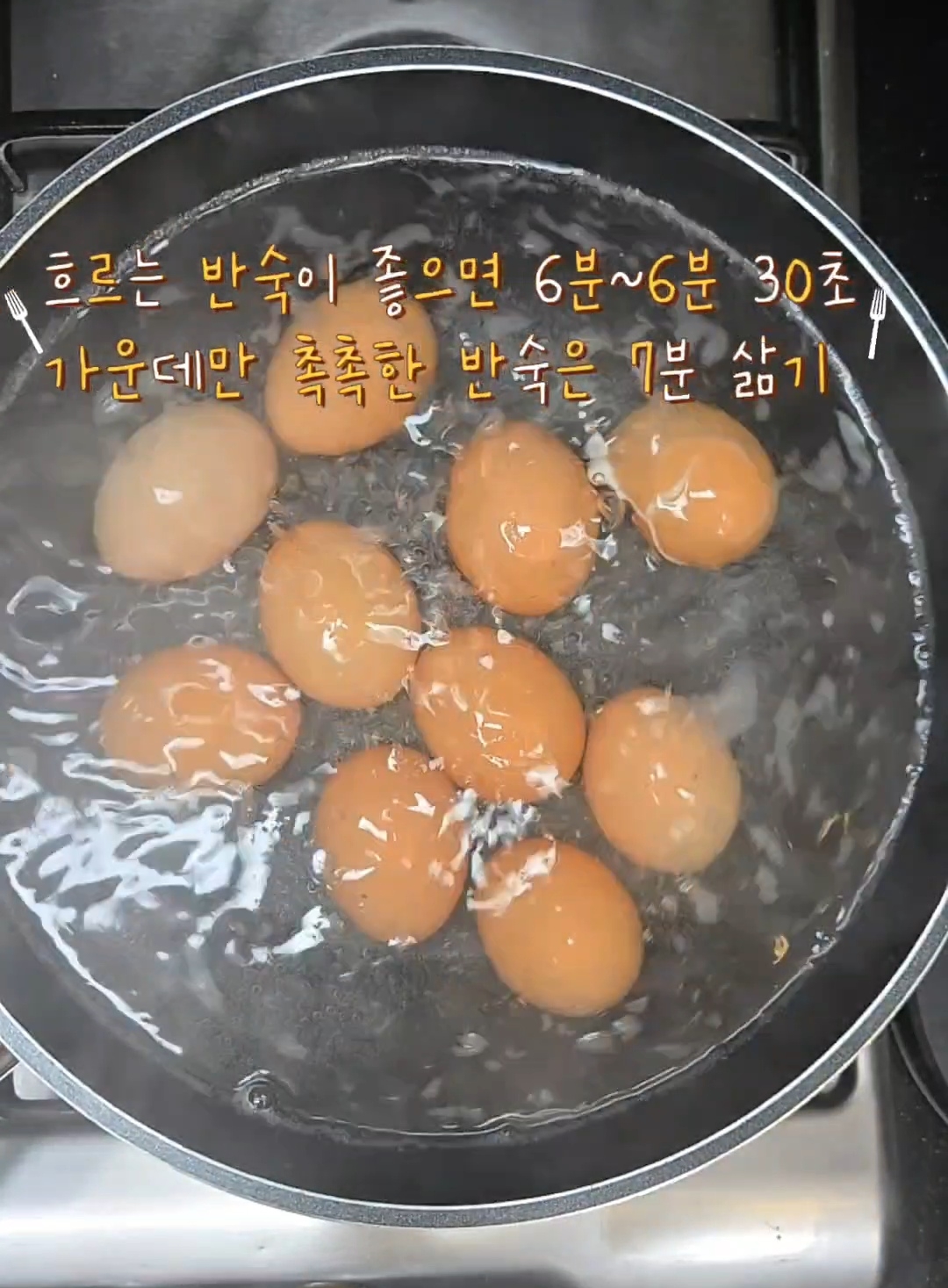 4. 흐르는 반숙은 6분~6분 30초, 가운데만 촉촉한 반숙은 7분 삶아주세요.