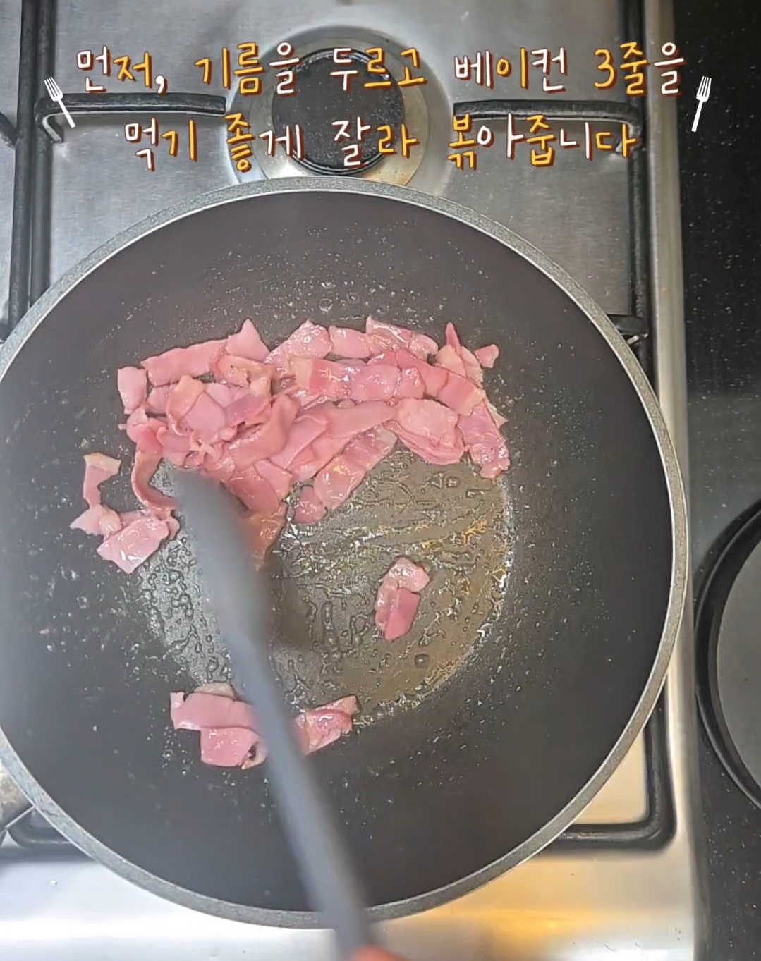 1. 먼저, 팬에 기름을 두르고 베이컨을