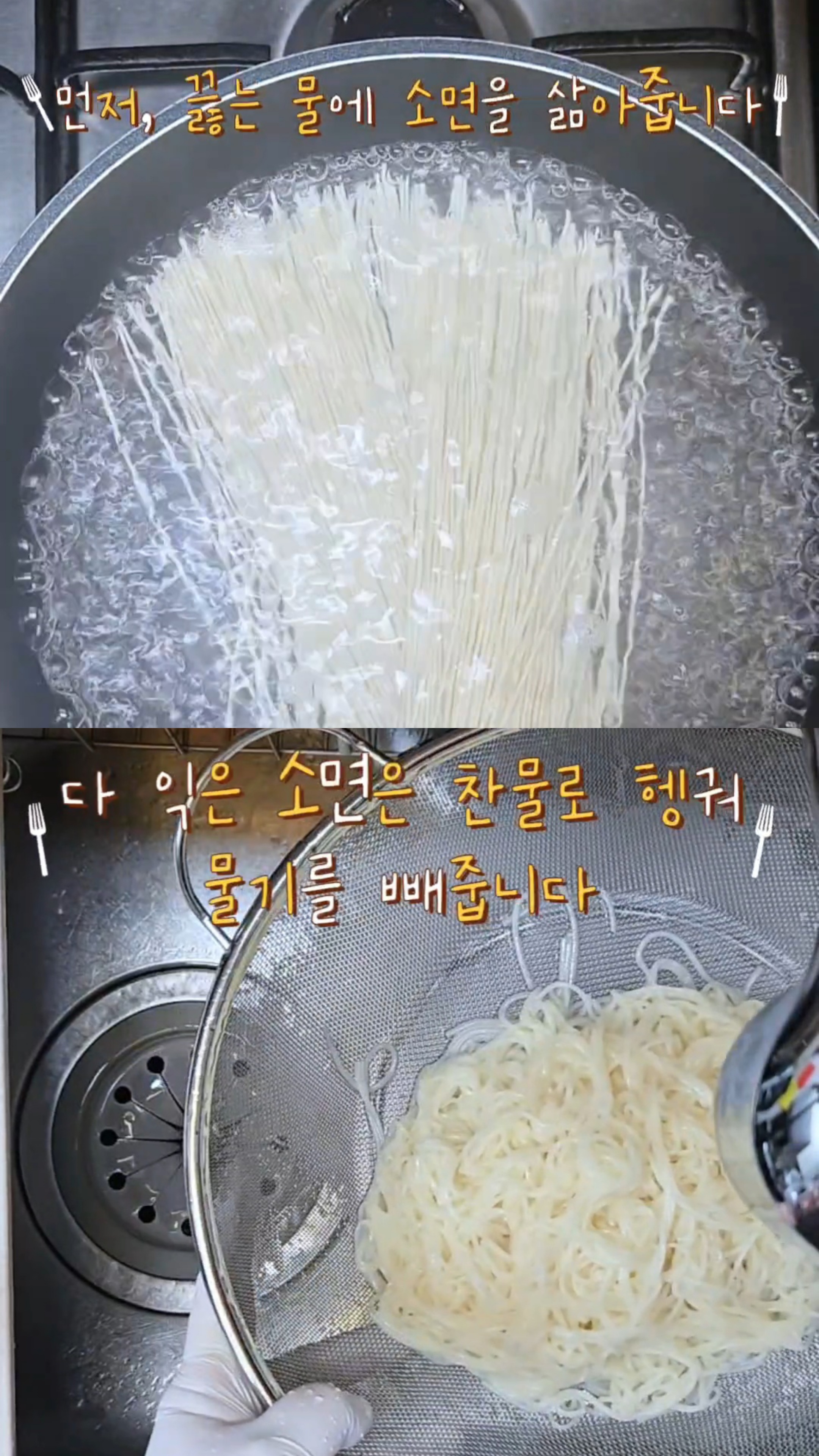1. 끓는 물에 소면을 삶은 뒤 찬물에 헹궈 물기를
